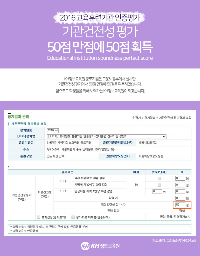 2016 기관건전성 평가 50점 만점에 50점 획득!