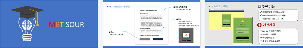- 로그인 및 회원가입, 정보 수정 및 탈퇴, 로그아웃 - MBTI 검사 및 결과 저장, 결과별 잘 맞는 MBTI 찾아주기 - MBTI 유형 설명 - 매칭된 친구에게 쪽지 보내기 또는 채팅하기 - 방명록 작성 - 개발자에게 쪽지 보내기 |