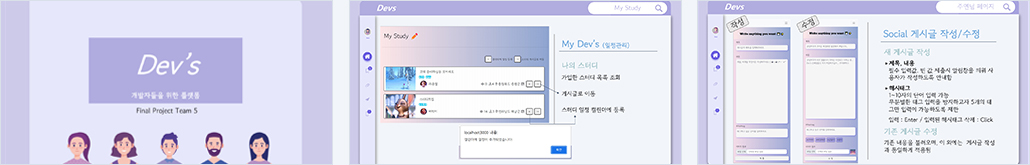 1. 회원가입 및 로그인, ID/ PW 찾기, 회원 정보 수정 및 회원 탈퇴 - 회원가입,로그인 : 폼 회원가입, 로그인 및 소셜 로그인(카카오) 구현, 비밀번호 암호화(Spring sequrity), 이메일, 휴대전화번호 중복 체크, 프로필 이미지 업로드 및 수정(firebase) 등 - ID/ PW 찾기 : 아이디 찾기, 비밀번호 찾기 기능 (구글 SMTP) - 프로필 페이지 : 프로필 이미지 및 개발자 명언 랜덤 노출 - 회원 탈퇴 : 회원 정보 및 작성 게시물 모두 삭제 - 반응형 UI 구현 2. 개발자 스터디 구하기 - 스터디 작성 기능 : 조회/ 입력/ 수정/ 삭제 - 스터디 모집 기능(해시태그, 모집 지역, 시작 일자) - firebase를 활용한 이미지 업로드 기능 - 스터디 신청 기능 - 스터디 검색 기능 |