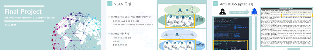학교 네트워크 서버를 DDoS로부터 안전하게 보호하기 위한 목적을 가지고, iptables 기술로 구현하였습니다.