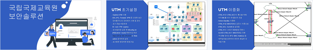 Routing, NAT, VLAN, 게이트웨이 이중화(VRRP), UTM 이중화(Sophos), L4 스위치(Alteon), SSH