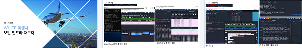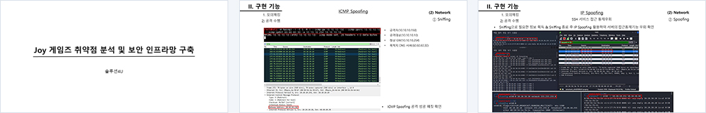 1. 외부와 통신 가능한 네트워크 구성 (NAT, VLAN, Single Area OSPF) 2. DATABASE 정보 관리 3. 링크 이중화를 통한 부하 분산 및 고가용성 보장 4. SSL을 이용한 암호화 통신 구성 5. 모의해킹을 통한 취약점 분석 6. UTM, WAF, IDS 등 보안 정책 도입 7. VPN을 이용한 본사-지사 보안성 제공 및 연결 8. 초당 패킷 허용량을 제한하여 DoS 및 DDoS 공격 방어 9. WAF 를 통한 웹서버 공격 차단 10. 지사측 UTM 도입을 통한 네트워크 보호 11. rsync 및 백업을 통한, 서버 데이터 유실 방지 |