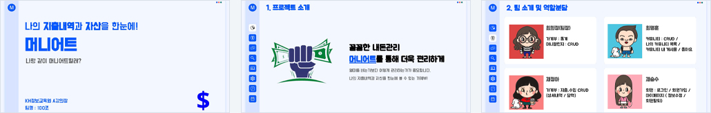 1. 가계부 - 지출내역 및 수입내역 CRUD - 선택한 기갈별 전체 보기 / 내열 별 구분해서 보기 - 월별 달력으로 보기 - 지출 / 수입 카테고리별 사용 통계
