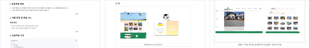 - 메인 - 회원 관리 : 회원가입, 로그인, 마이페이지 - 커뮤니티 게시판 : 작성, 수정, 삭제, 대댓글, 추천수, 조회수, 검색, 찜하기 기능 - 관광지, 맛집 리스트 및 상세페이지 : 페이징, 검색 기능 |