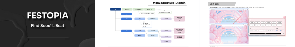 - 주 타겟층 : 10대 ~ 40대 - 웹 사이트 컨셉 : 밝고 컬러풀한 디자인 / 트렌디 / 심플 / 깔끔 - 웹사이트 주제에 맞춰서 축제를 연상하는 밝은 분위기의 사이트 구성에 초점 |