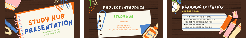 개요 스터디허브는 온라인 스터디 그룹 개설 및 스터디룸 제공을 위한 서비스 플랫폼 입니다. 스터디 그룹의 개설을 제공하며, 제공된 스터디 그룹별 스케쥴과 스터디룸으로 그룹원들 간의 일정관리와 화면공유 및 채팅 기능을 제공합니다.