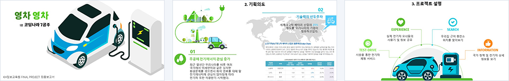 환경문제와 함께 떠오르는 친환경 자동차에 대한 관심을 목표로 전기차 및 친환경 자동차에 대한 정보 공유 및 전기차 이용자들 간의 커뮤니티와 친환경 차량을 생산하는 업체들과의 연계를 통한 시승 예약 시스템을 구현하여 종합적인 친환경 자동차 커뮤니티를 구축하는데 주안점을 두었습니다. |