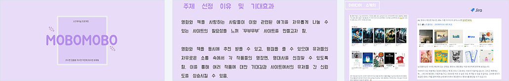 개요 영화와 책을 사랑하는 사람들이 이와 관련된 얘기를 자유롭게 나눌 수 있는 사이트의 필요성을 느껴 ‘무부무부’ 사이트를 만들고자 함. 영화와 책을 동시에 추천 받을 수 있고, 평점을 줄 수 있으며 유저들의 자유로운 소통 속에서 각 작품들의 명장면, 명대사를 선정할 수 있도록 함. 이를 통해 여러 작품에 대한 기대감과 사이트에서의 유저들 간 신뢰도를 상승시킬 수 있음.