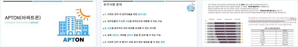 공지사항 및 아파트 일정 달력, 투표/서명 기능, 관리비 조회 기능, 민원접수 기능, 기타 아파트 주변 지역에 대한 정보 제공 |