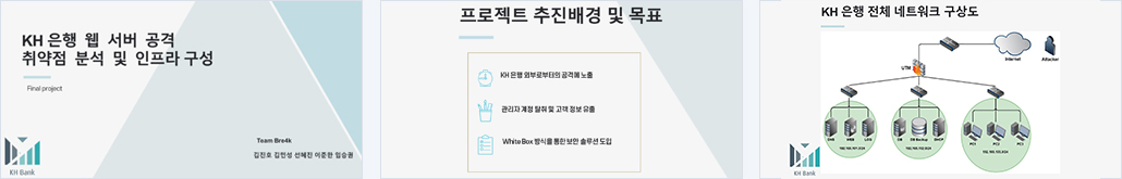 KH은행이 외부로부터 공격을 받아 관리자 계정 탈취 및 고객들의 개인정보 유출이 발생, 보안 인프라망 구축을 의뢰하였다. Bre4k팀은 White Box 방식으로 모의해킹을 진행하여 KH은행 서버를 점검, IDS/IPS/UTM 등 보안 솔루션을 도입하였다. 보안 관리 체계를 마련하고, 이를 기반으로 시스템 운영 지원한다. |