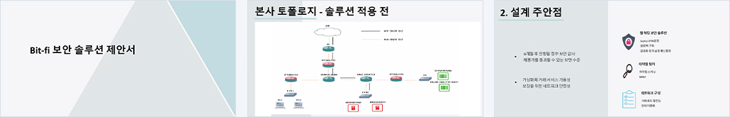 보안장치 및 주요 서버 배치도 확인 및 검토 모의해킹을 통한 취약점 분석 및 진단 체크리스트를 기반으로 보안 솔루션 설계 본사/지사간 VPN 연결 이중화를 통한 가용성 보장 |