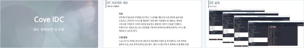배경 정보보호의 중요성이 대두됨에 따라 Cove IDC는 개인 정보 유출과 네트워크 장애 등의 보안 관련 문제를 예방하기 위해 보안 SI 업체인 BuildC 사에게 취약점 분석 및 설계 보완/구축, 검증을 의뢰했다.