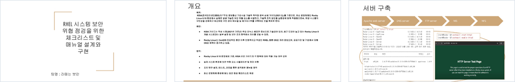 | 팀장/팀원 | 전**(팀장) : 1. 네트워크 - VMware 기반 가상환경 및 네트워크 구성 - 서버 및 클라이언트 Rocky Linux 8.10 OS 설치 - Apache 서버 설치 2. KISA 상세 가이드를 참조하여 Rocky Linux 8.10 버전 OS에서 취약점 점검 및 설정 후 기술 문서 작성 2-1. FTPusers 파일 설정 - vsFTP root 접속 차단 - vsFTP 접근 제어 설정 2-2. at 서비스 파일 소유자 및 권한 설정 - /usr/bin/at 파일 SUID 제거 - /etc/at.allow, /etc/at.deny 파일 수정 2-3. SNMP 서비스 구동 여부 및 Community String 설정 - SNMP 서비스 중지 - /etc/snmp/snmpd.conf 파일 수정 2-4. 로그온 시 경고 메세지 제공 - 서버 및 Telnet, FTP, SMTP, DNS 배너 설정 2-5. NFS 설정파일 접근 권한 설정 - /etc/exports 파일 소유자 및 권한 변경 2-6. expn, vrfy 명령어 제한 - SMTP 서비스 중지 - noexpn, novrfy 설정 2-7. Apache 웹 서비스 정보 숨김 - ServerTokens Prod, ServerSignature Off로 설정 2-8. 정책에 따른 시스템 로깅 설정 - /etc/rsyslog.conf 파일 수정 |