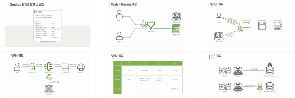 Sophos utm은 보안 정책을 적용 받는 네트워크와 그렇지 않는 네트워크를 분리하면서 Firewall, IPS, WAF, Web Filtering, Load balancing, VPN 등의 기능을 통해 공격을 사전에 예방하고, 침해 발생 시 빠르게 조치하며, 유해 사이트를 차단하고, 서버 트래픽을 분산하여 과부하를 줄이는 등의 역할을 수행한다.
