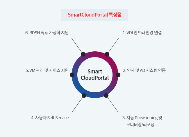 SmartCloudPortal은 ‘인사 연동에서 가상 데스크톱 관리까지’ 통합적이고 효율적으로 가상 환경을 관리할 수 있는 Web 기반의 자동화 관리 솔루션 입니다. SmartCloudPortal을 통해 VDI 인프라 관리에 따른 업무 부하 및 운영 비용을 절감할 수 있으며, 손쉽게 VM관리 업무를 처리할 수 있도록 합니다. 또한 일련의 프로세스를 하나의 작업 공간에서 Smart하게 운영 및 관리할 수 있게 되며, 통합 관리 툴을 통해 VDI 관리를 효율적으로 운영할 수 있습니다.