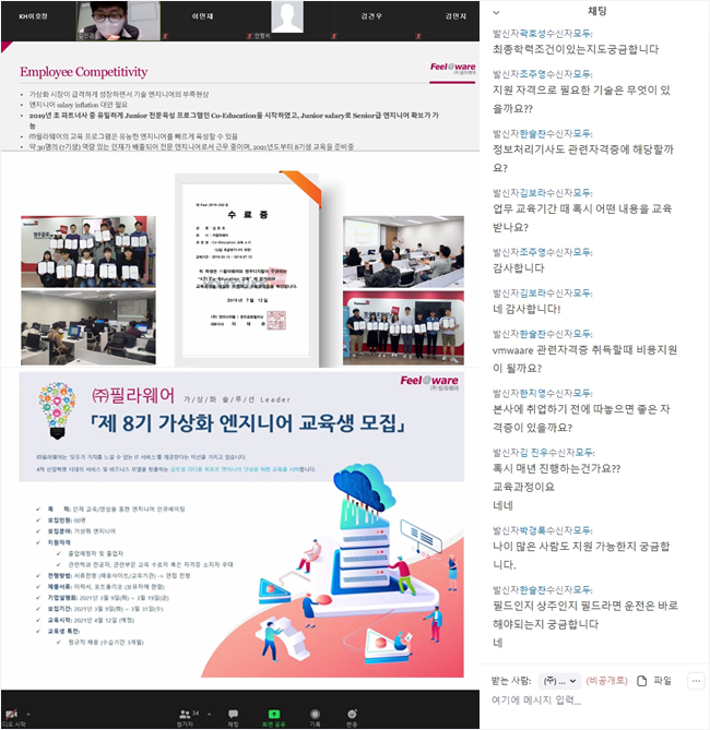 앞서 기업 소개와 가상화 엔지니어로서의 비전에 대해 김민곤 수석님께서 말씀해 주셨는데요. 뒤이어 가상화 엔지니어 교육 및 채용에 대해 박진희 차장님께서 설명해 주셨습니다. 참여한 KH정보교육원 훈련생의 반응을 보니, 비대면으로도 숨길 수 없는 뜨거운 열정이 질문 속에 고스란히 담겨있었습니다.
