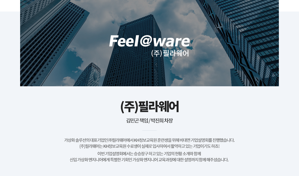 4차 산업혁명시대의 비전 있는 선택, 가상화 엔지니어! KH정보교육원 수료생이 앞으로 활약할 모습을 기대해보겠습니다~! 바쁘신 일정에도 기업설명회를 진행해주신 김민곤 수석님과 박진희 차장님께도 감사 말씀 드립니다.